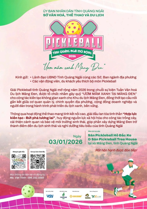 Giải Pickleball tỉnh Quảng Ngãi mở rộng năm 2026 sẽ diễn ra từ 02–03/01/2026 tại xã Măng Đen, trong khuôn khổ chuỗi hoạt động chào năm mới và Tuần Văn hóa – Du lịch Măng Đen, Mùa hoa anh đào 2026. Lễ khai mạc được tổ chức lúc 7h30 ngày 03/01/2026 với sự tham dự của các câu lạc bộ và vận động viên trong và ngoài tỉnh.